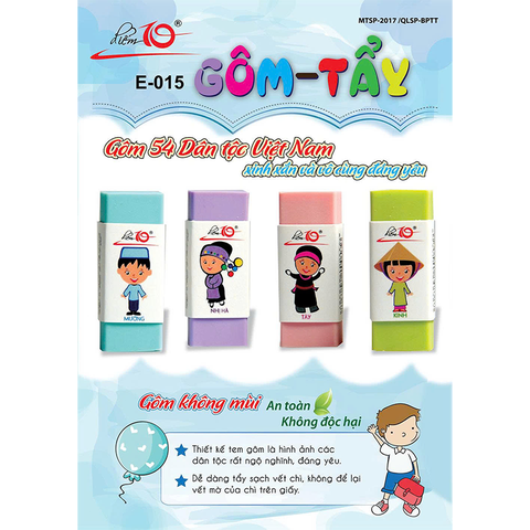 Gôm E-015 là gôm tẩy bút chì chất lượng, giúp xóa sạch nét chì rõ ràng, không lem bẩn, hạn chế rách giấy. Chất liệu gôm mềm, an toàn khi sử dụng. Sản phẩm đóng hộp 40, phù hợp cho học sinh, văn phòng và cửa hàng văn phòng phẩm.
